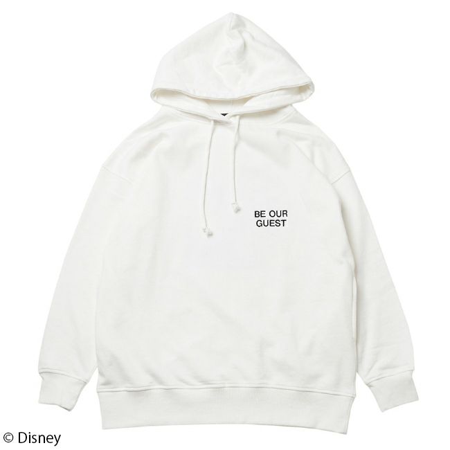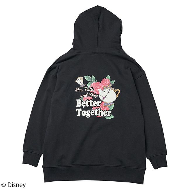 バックにはポット夫人とチップのコンビのグラフィック、フロントは刺繍ロゴでシンプルにもあわせやすいデザインです。