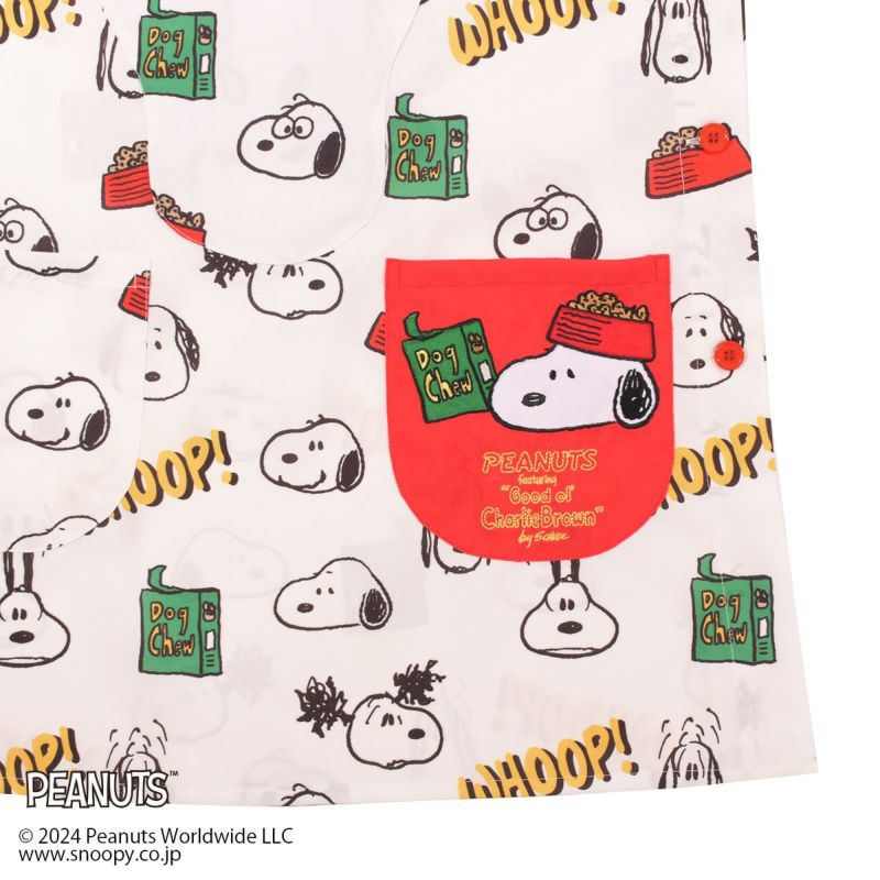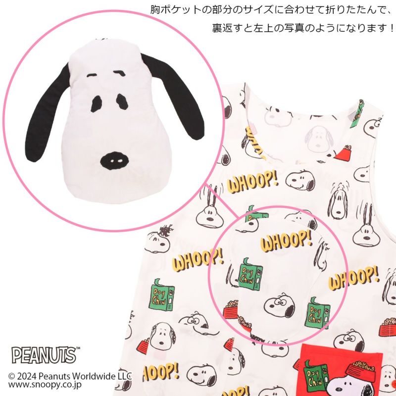 フロントのフェイスシェイプのポケットにエプロンを収納できる「スヌーピー」デザインのエプロンです。