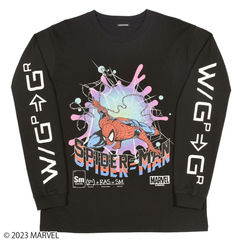 『スパイダーマン』のロングスリーブTシャツです。化学式のような特別な意味が隠されている袖のデザインにもご注目ください。