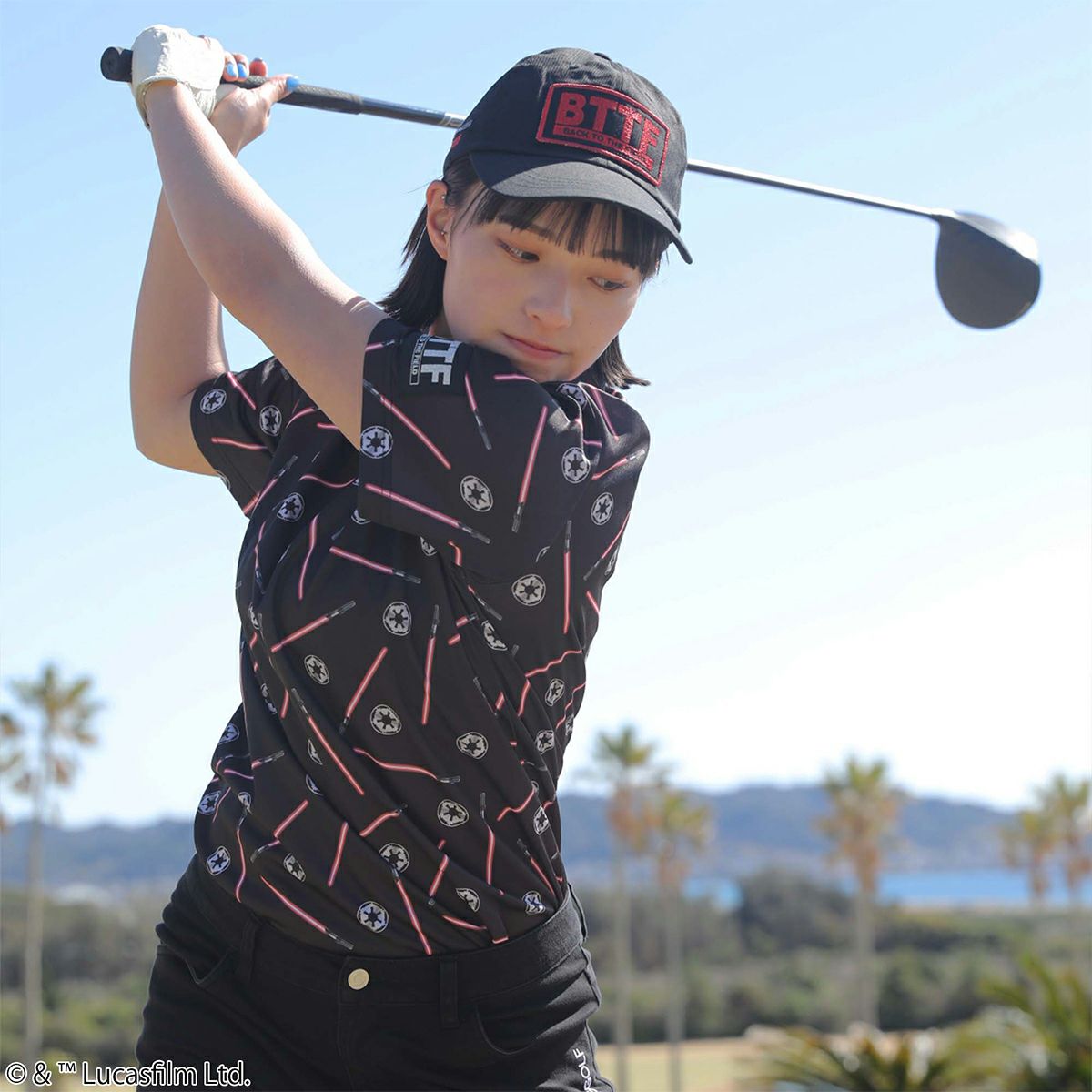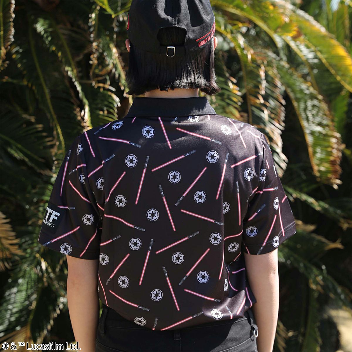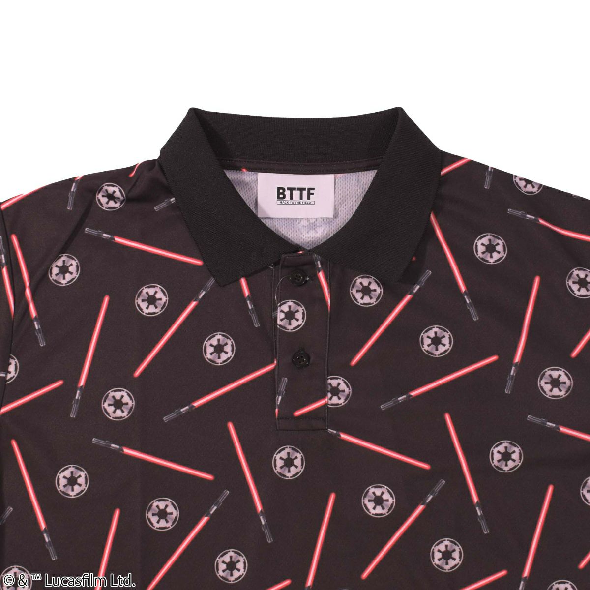 『STAR WARS』で銀河帝国が使用する「ライトセーバー」やアイコンが総柄にデザインされたポロシャツです。