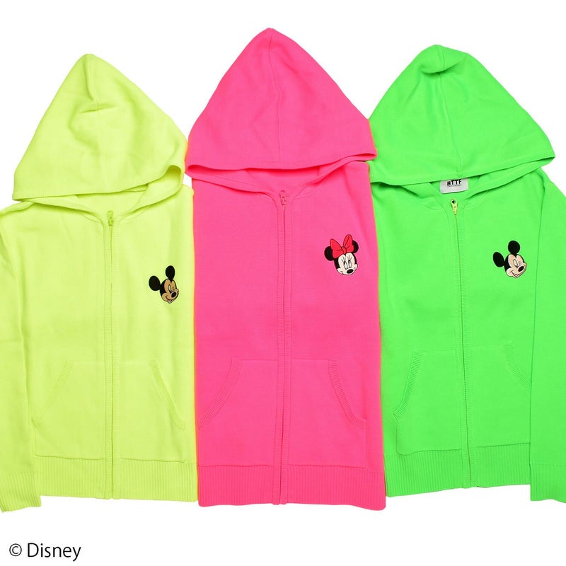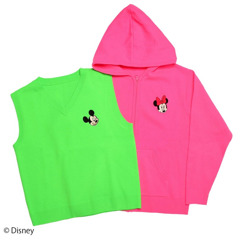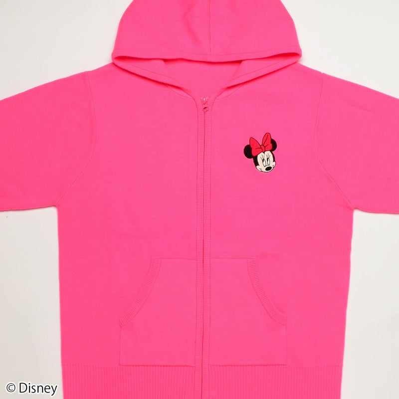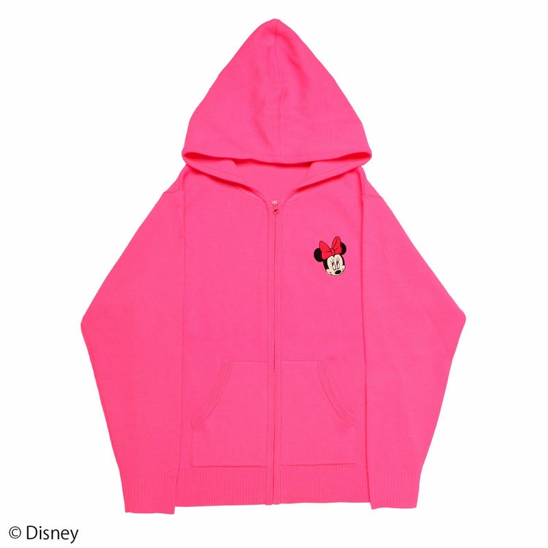 胸元に「ミニーマウス」の刺繍をデザインしたニットパーカー。ビビッドなカラーが目を引き、スポーツファッションのアクセントに。