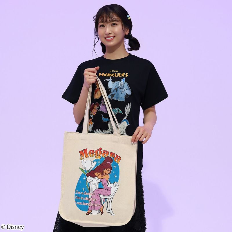 トートバッグには大人気「メガラ」を大きくプリントし、Tシャツには『ヘラクレス』に登場するキャラクター「ヘラクレス」、「ハデス」、「メガラ」、「ペイン&パニック」、「ピロクテテス」、「ペガサス」がデザインされています。