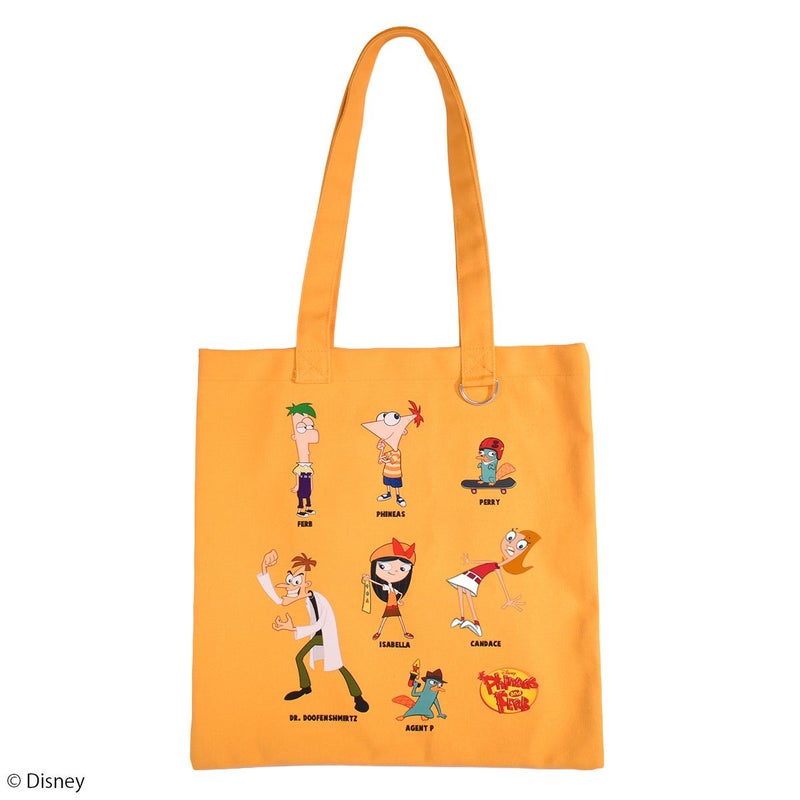 こちらは、『フィニアスとファーブ』に登場する「フィニアス」、「ファーブ」、「ペリー」、「キャンディス」、「イザベラ」、「ドゥーフェンシュマーツ博士」、「エージェントP」がデザインされたトートバッグです。