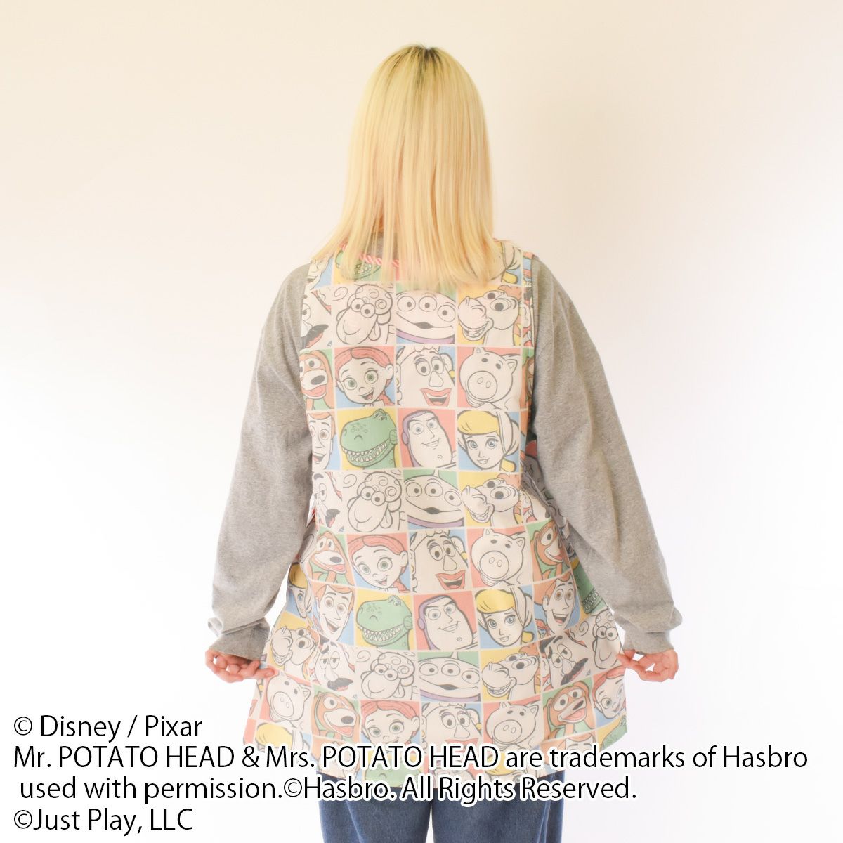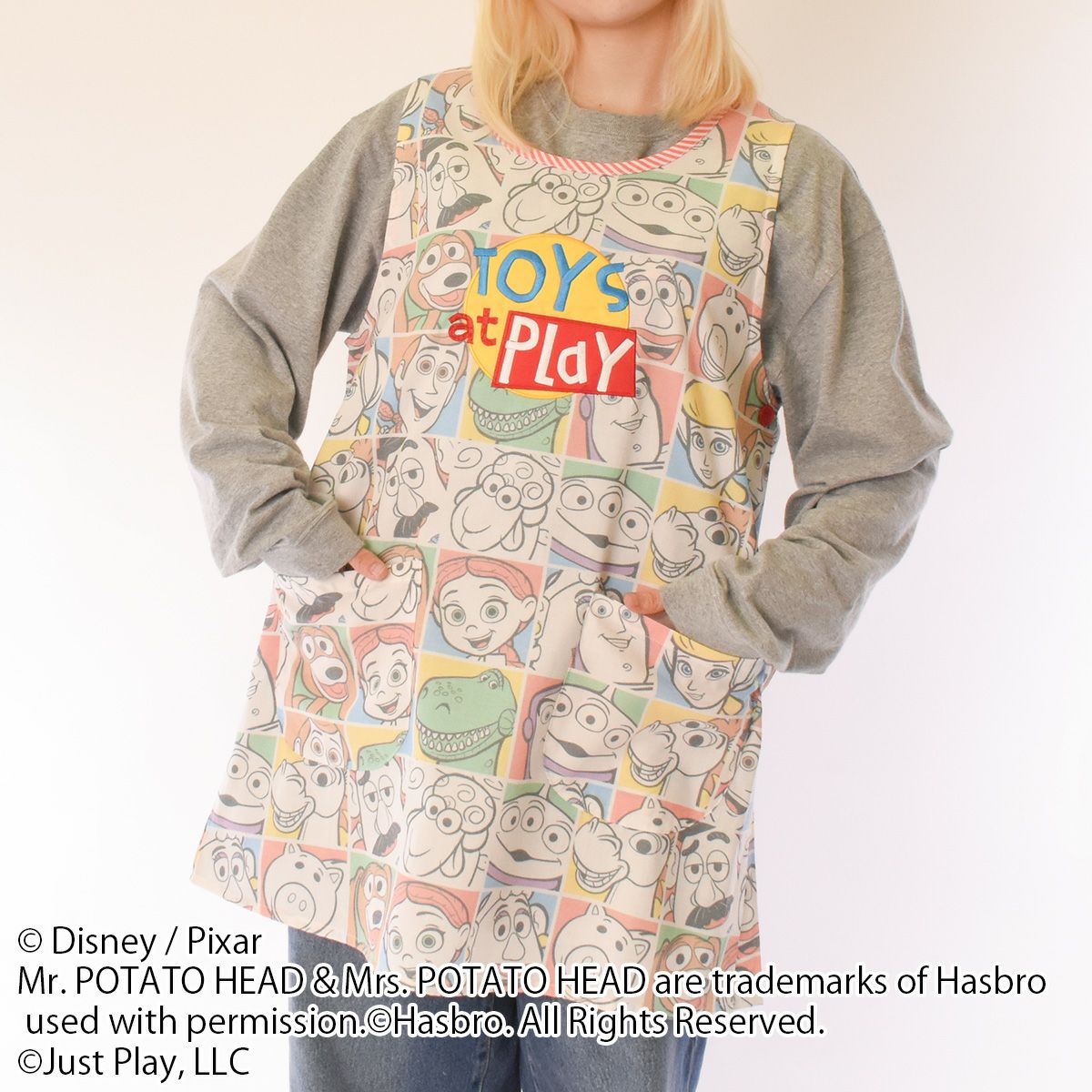 『トイ・ストーリー』のキャラクターが総柄にデザインされた大人用カバーエプロン。