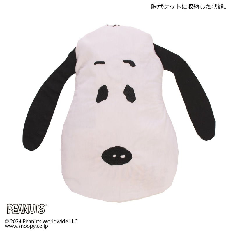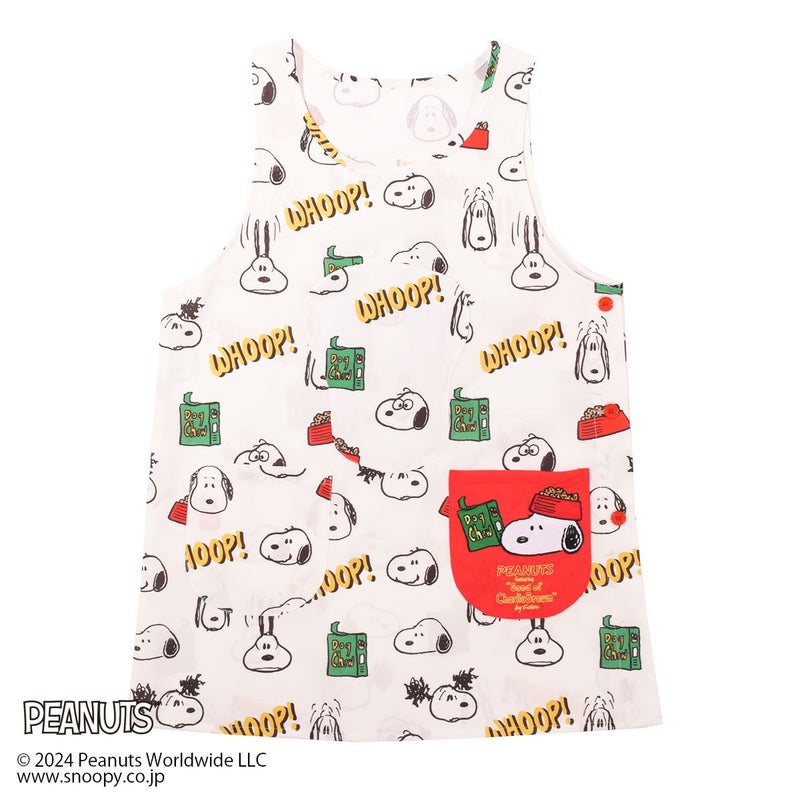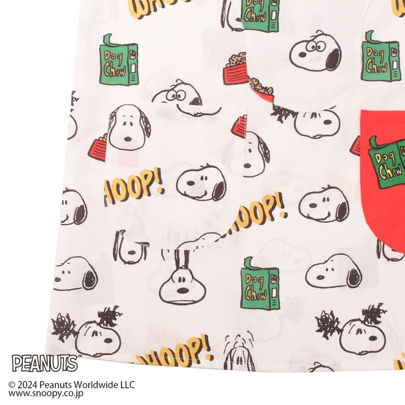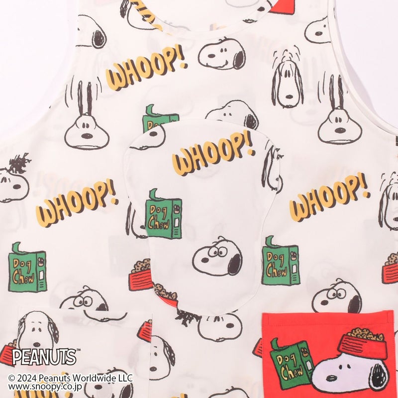 フロントのフェイスシェイプのポケットにエプロンを収納できる「スヌーピー」デザインのエプロンです。