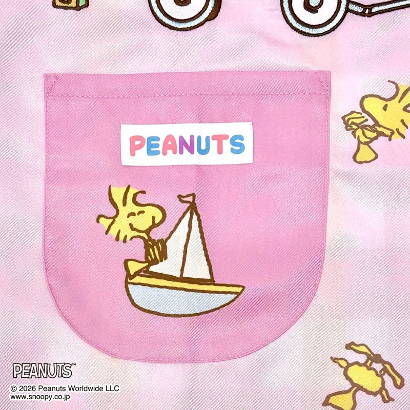 ベビーカラーが可愛い「スヌーピー」のエプロン。「ウッドストック」がたくさん散りばめられた楽しいデザインで、前開きタイプだから着脱も簡単です。