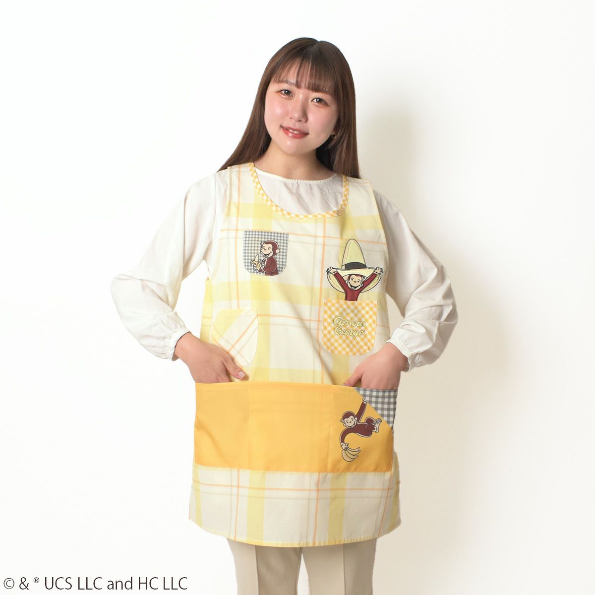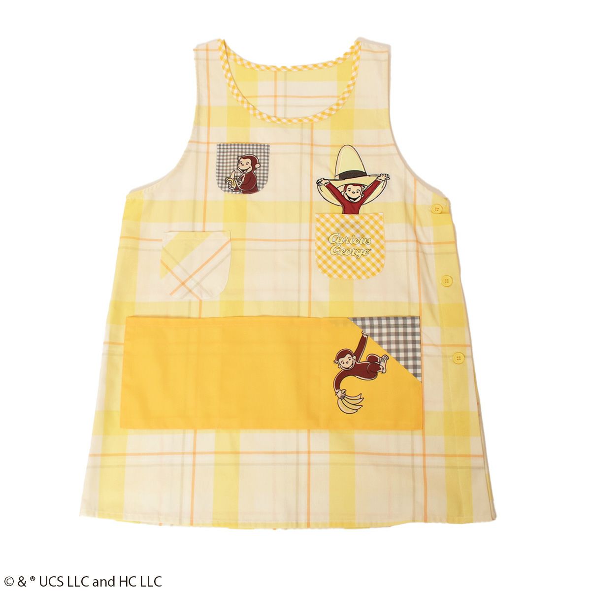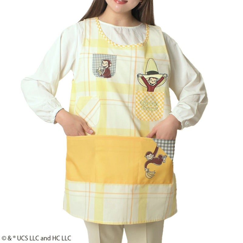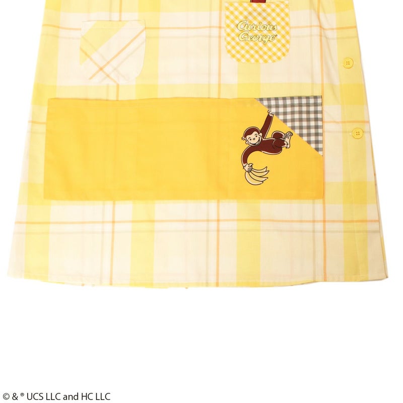 胸元には刺繍の「おさるのジョージ」がデザインされており、フロントにポケットが6つあるので持ち物の仕分けがしやすいエプロンです。