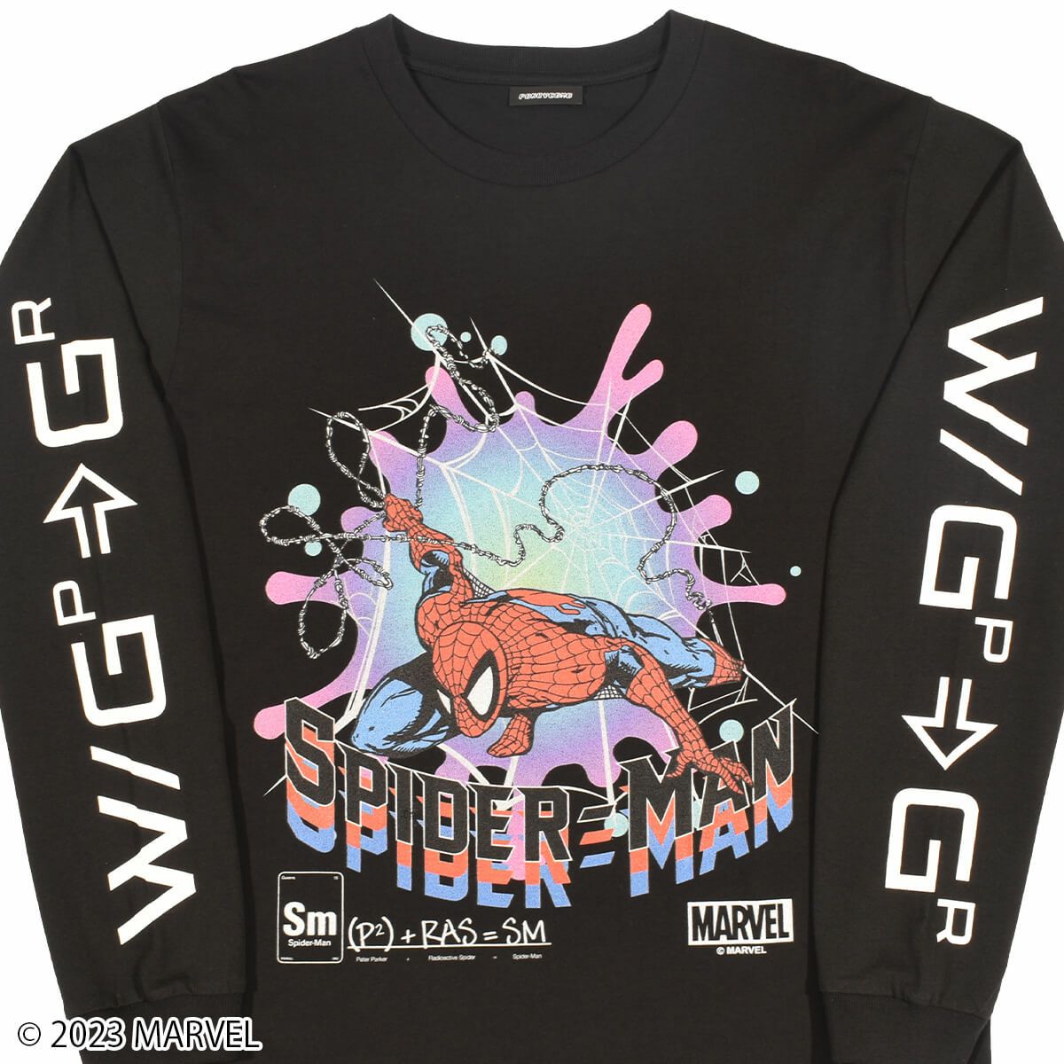 『スパイダーマン』のロングスリーブTシャツです。化学式のような特別な意味が隠されている袖のデザインにもご注目ください。