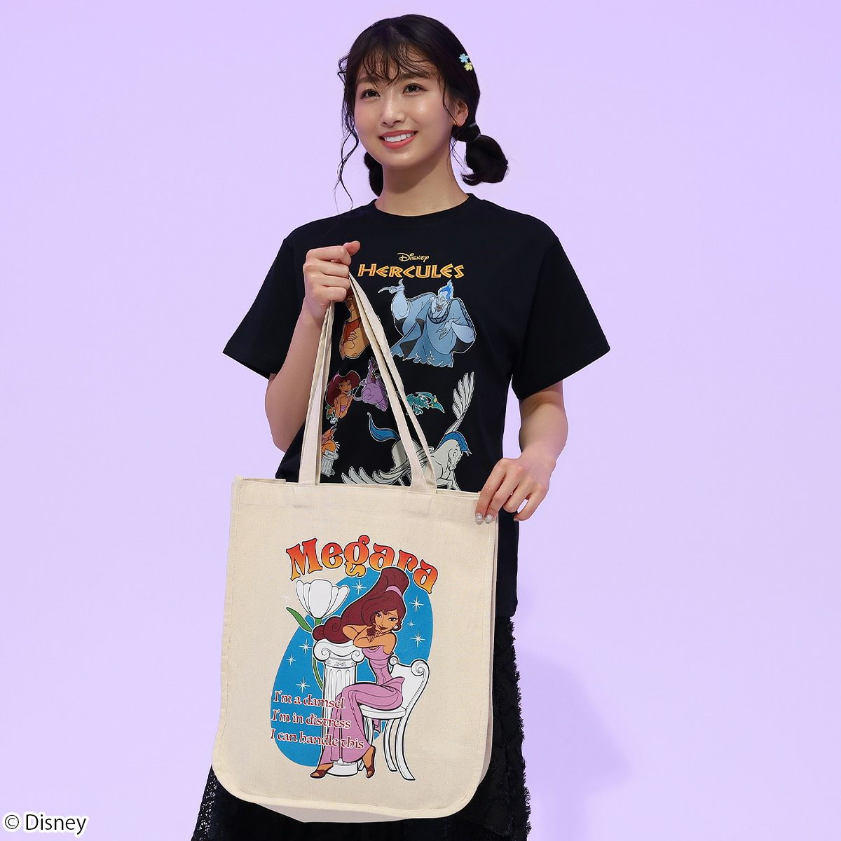 トートバッグには大人気「メガラ」を大きくプリントし、Tシャツには『ヘラクレス』に登場するキャラクター「ヘラクレス」、「ハデス」、「メガラ」、「ペイン&パニック」、「ピロクテテス」、「ペガサス」がデザインされています。