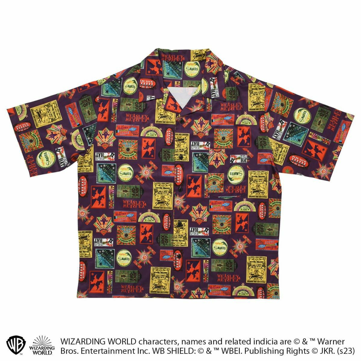『ハリー・ポッター』に登場する「ウィーズリー家」の双子「フレッド」「ジョージ」が経営する悪戯専門店のアイコンが総柄にデザインされた総柄シャツです。