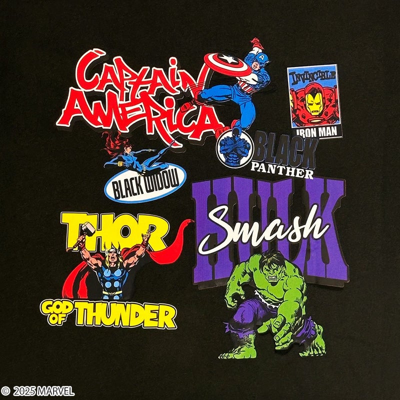 こちらは、『アベンジャーズ』の「キャプテン・アメリカ」、「アイアンマン」、「ブラック・ウィドウ」、「ブラック・パンサー」、「ソー」、「ハルク」デザインのコミックアートTシャツです。