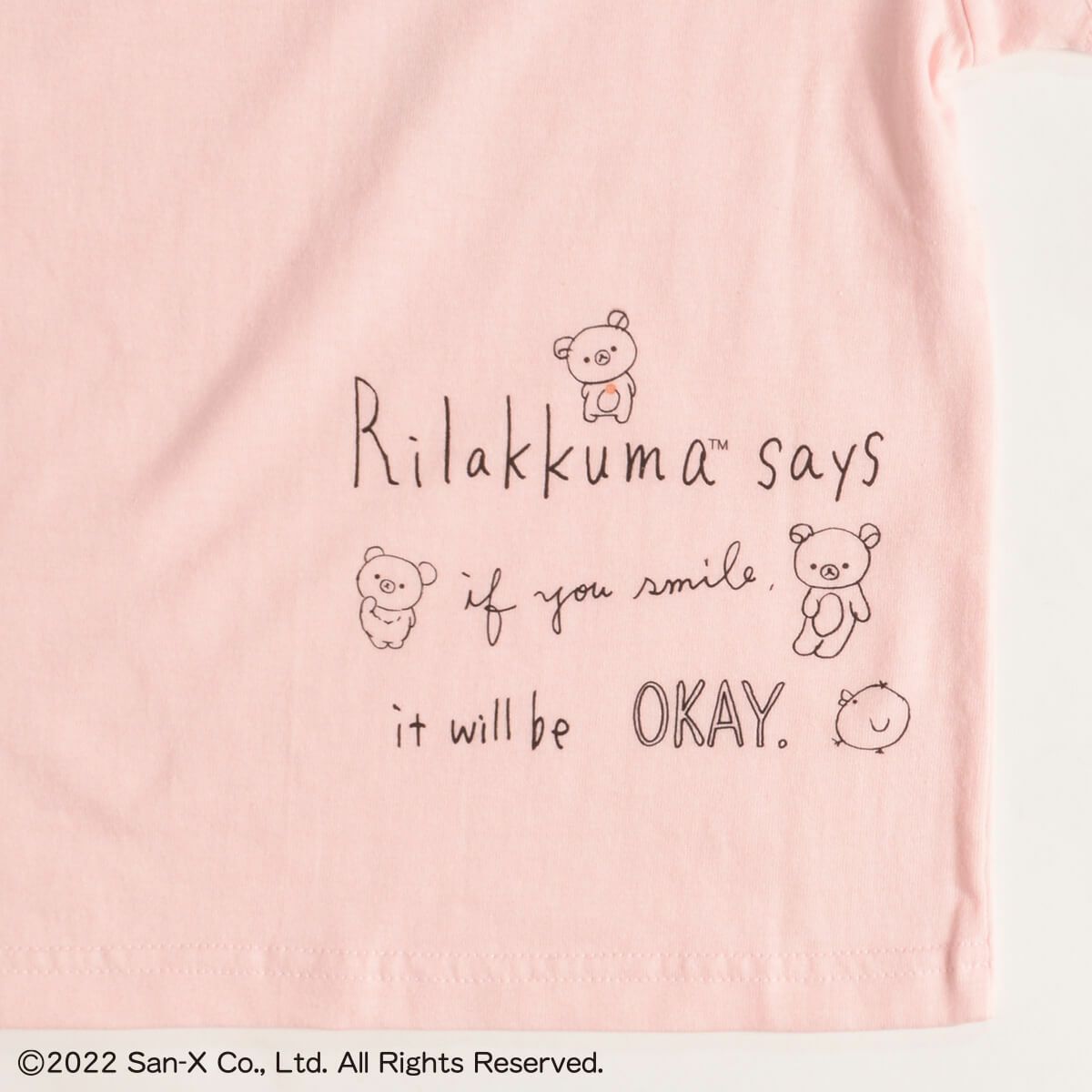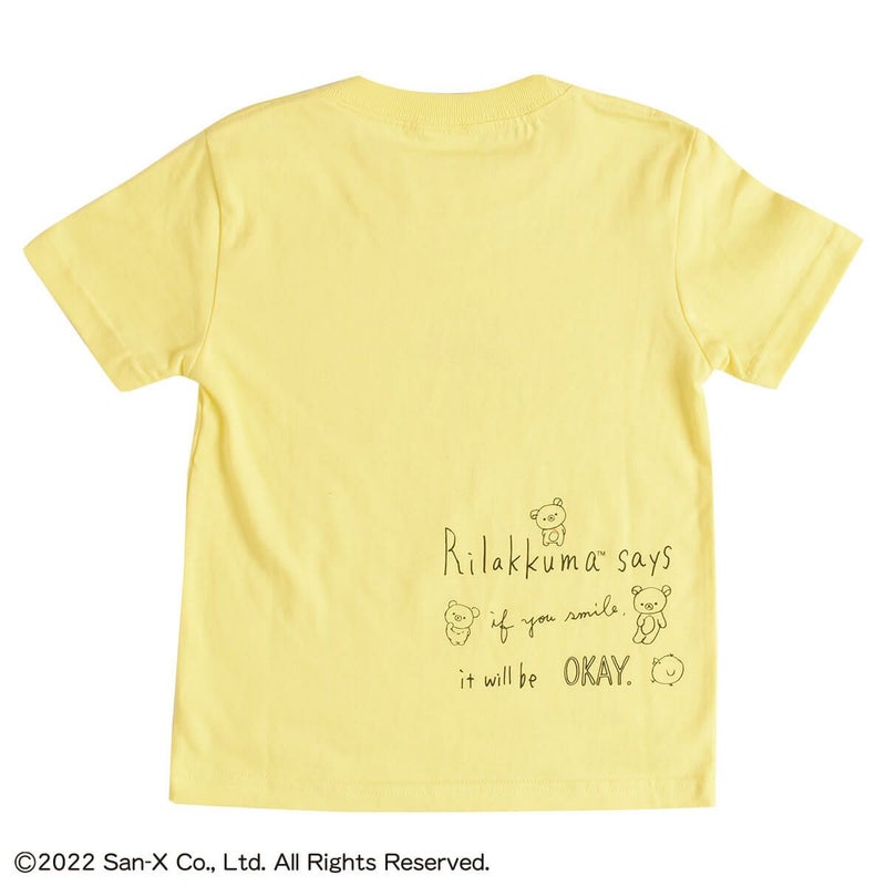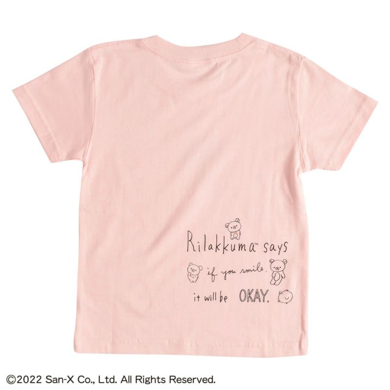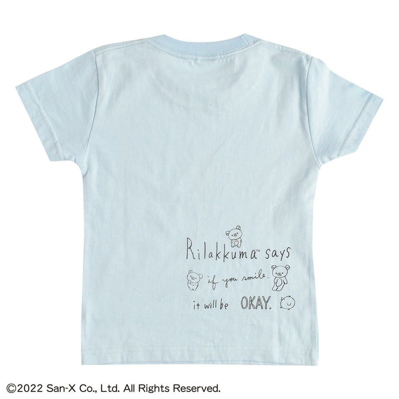 こちらはフロントには、ぼーっと考えごとをしている様子がキュートな「リラックマ」をデザインし、バックプリントにはメッセージをデザインしたキッズTシャツ(110cm)です。