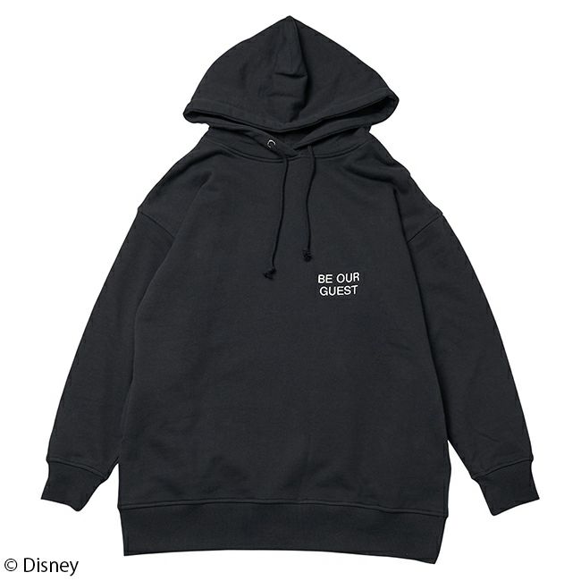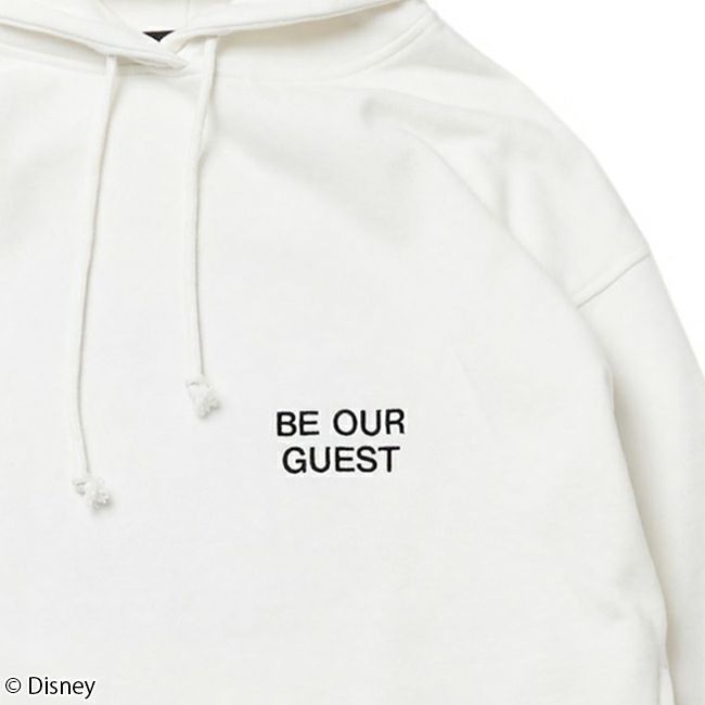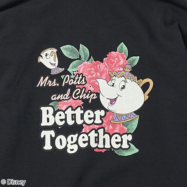バックにはポット夫人とチップのコンビのグラフィック、フロントは刺繍ロゴでシンプルにもあわせやすいデザインです。
