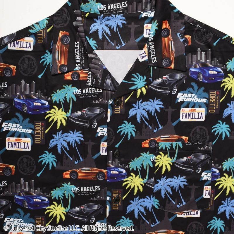 映画『ワイルド・スピード』の総柄デザインのアロハシャツです。
